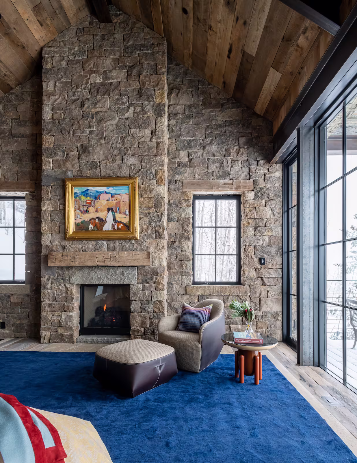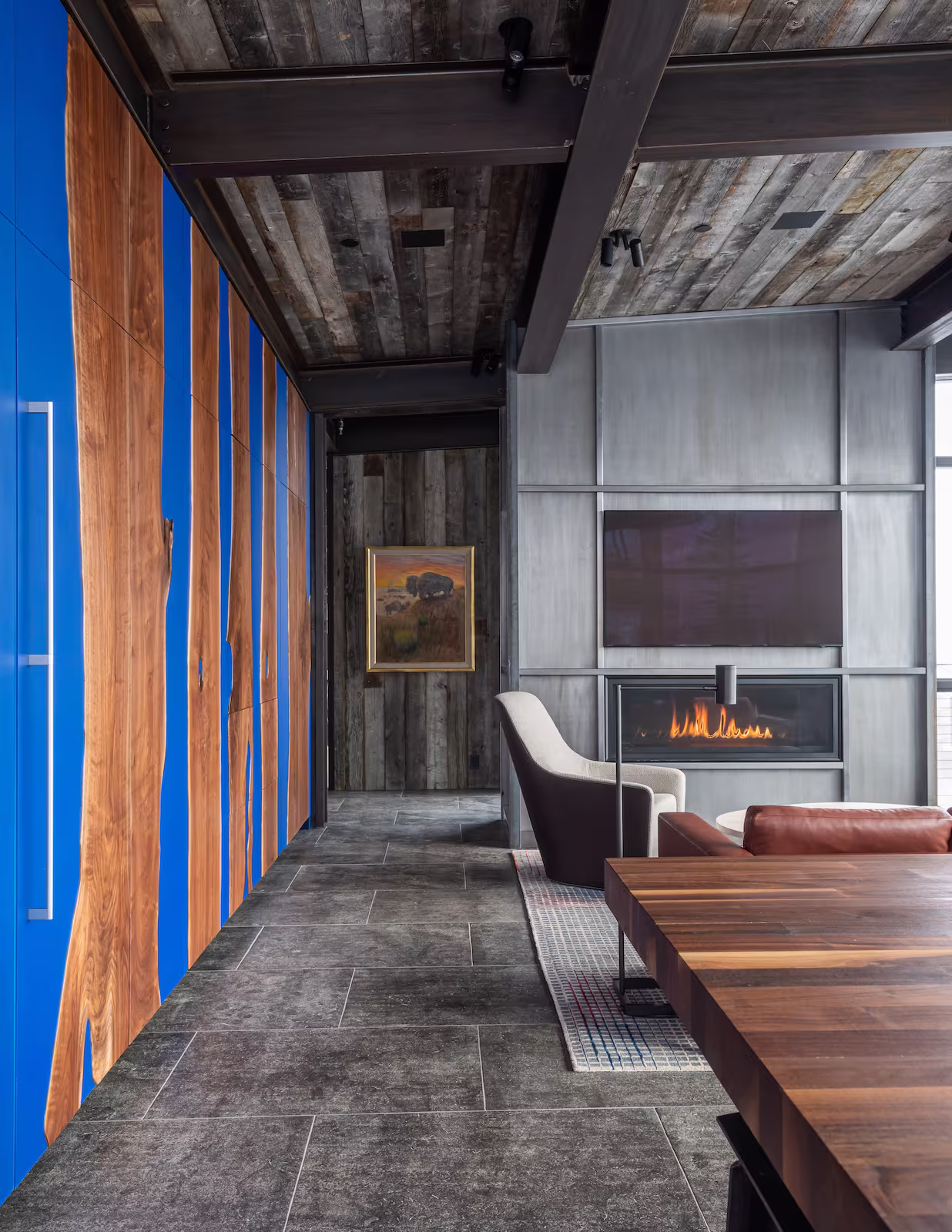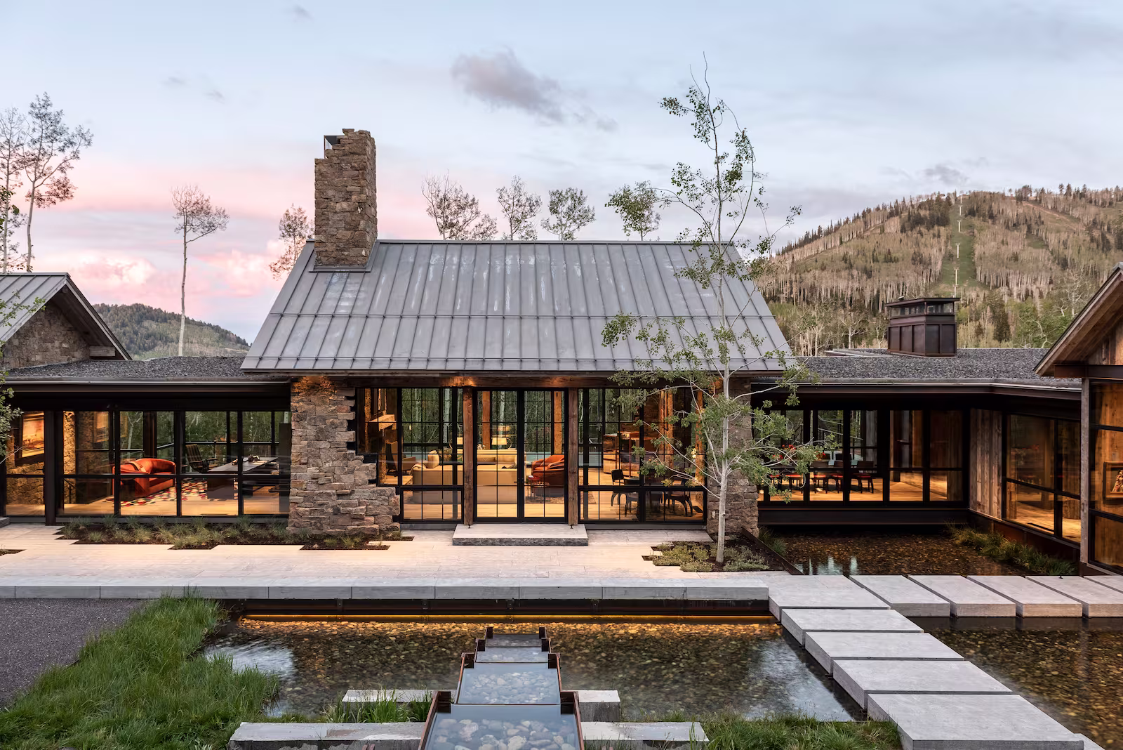 First conceived as a “JLF Modern,” this hillside Park City house is grounded in century-old Western history evoked through rustic reclaimed corral board siding, two-foot-thick Montana moss rock walls strategically deconstructed as tumbled “ruins” and a homesteader-like cluster of structures. Contemporary expanses of glass and steel connect timber and stone forms and invite nature, capturing high-country panoramas and the sounds and sparkle of multiple Verdone Landscape Architects water features, including a mining sluice box-style waterfall that flows under the opens-to-the-elements dining room. An oversized lacquered-and-weathered red steel front door by Paul Bertelli and Scott Epselin heralds the drama within – and earned a 2021 Mountain Living magazine cover.