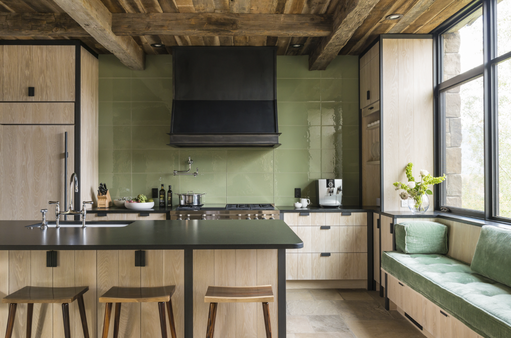The kitchen of this Jackson Hole house plays a contemporary cabinet design in creamy washed oak against the rustic, reclaimed timber ceiling. Wild sage growing in the surrounding landscape inspired the color choice for backsplash tile and window-seat cushion, earning the kitchen notice in a Living Etc. article on “Sage Green Room Ideas That Ooze Serenity, Sophistication, and Style.” Jackson Hole interior designer Tayloe Piggott sourced the verdant velvet fabric for the kitchen visitor’s bench, handy for keeping the cook company while taking in Teton mountain views. Meanwhile, the cabinets’ light tone suggests the dry meadow grasses that also grow wild in the surrounding landscape.