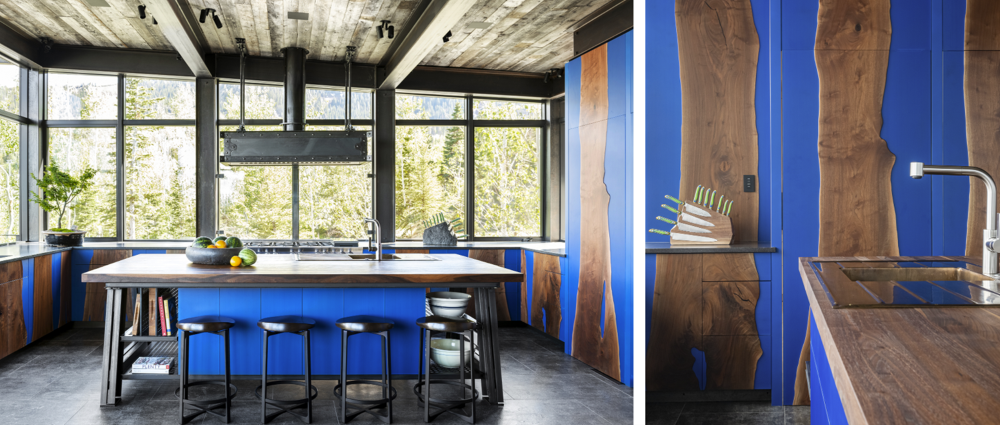 As proven by many of JLF’s legacy home designs, not all wooden kitchens need to be rustic. For a modern home we designed in Park City, Utah, the idea of trees standing against a blue-sky backdrop provided the inspiration for the dramatic custom-built cabinetry, above. To achieve the unique wood-meets-cobalt effect, we created a proprietary process with our design-build team at Big-D Signature, slicing walnut to mimic natural tree forms and melding the wood with translucent blue panels to create a “forest of walnut trees.” The design enhances the connection with the surrounding forest on view through wraparound windows, creating the sense of the kitchen as a treehouse aerie.